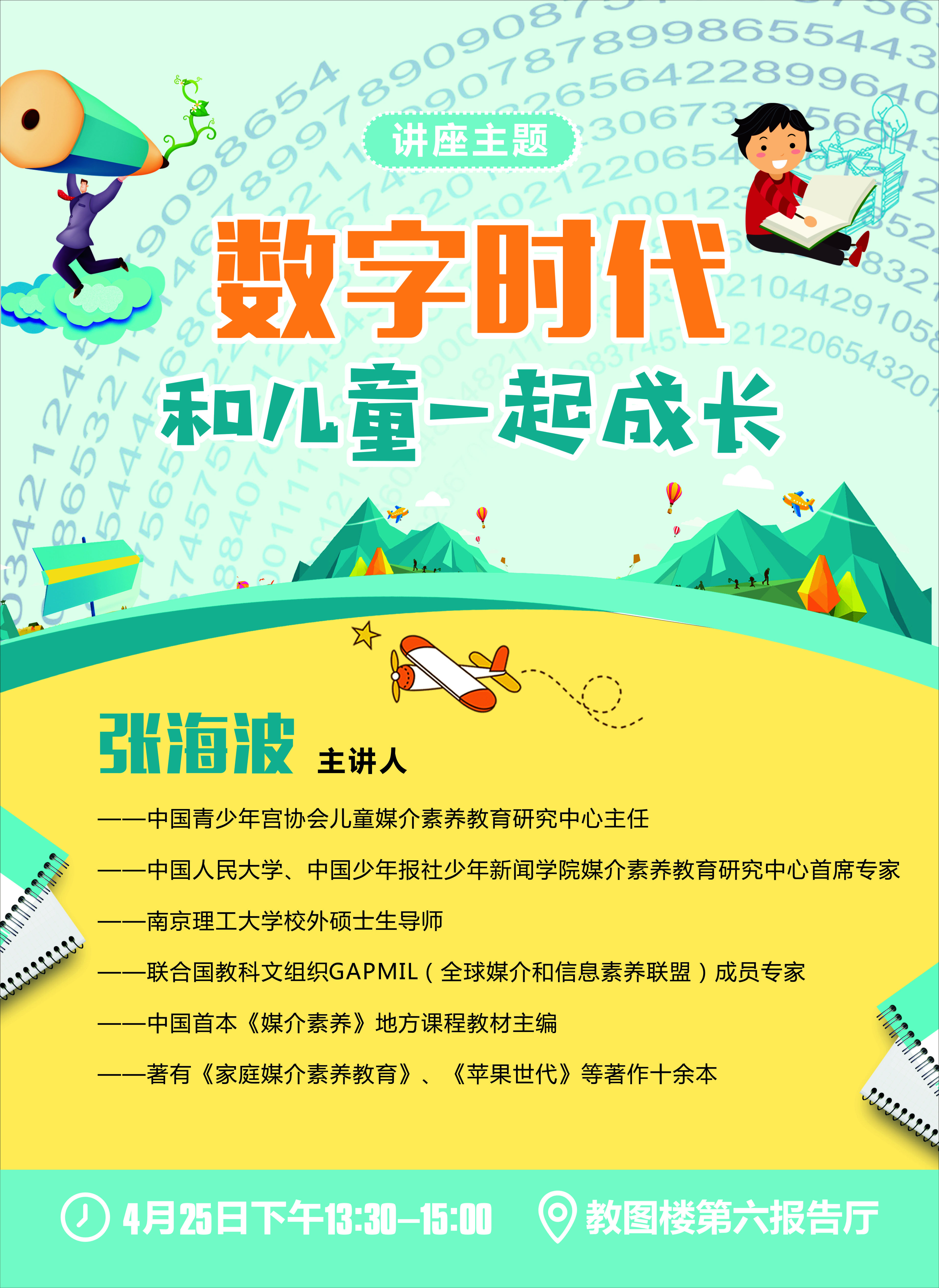 4月25日(周二)下午13:30-15:30,文化传播学院和校图书馆联合举办媒介素养和家庭媒介素养教育讲座,讲座主题:《数字时代,和儿童一起成长》,地点:教图楼六层第六报告厅,主讲人:张海波,欢迎广大师生前往!